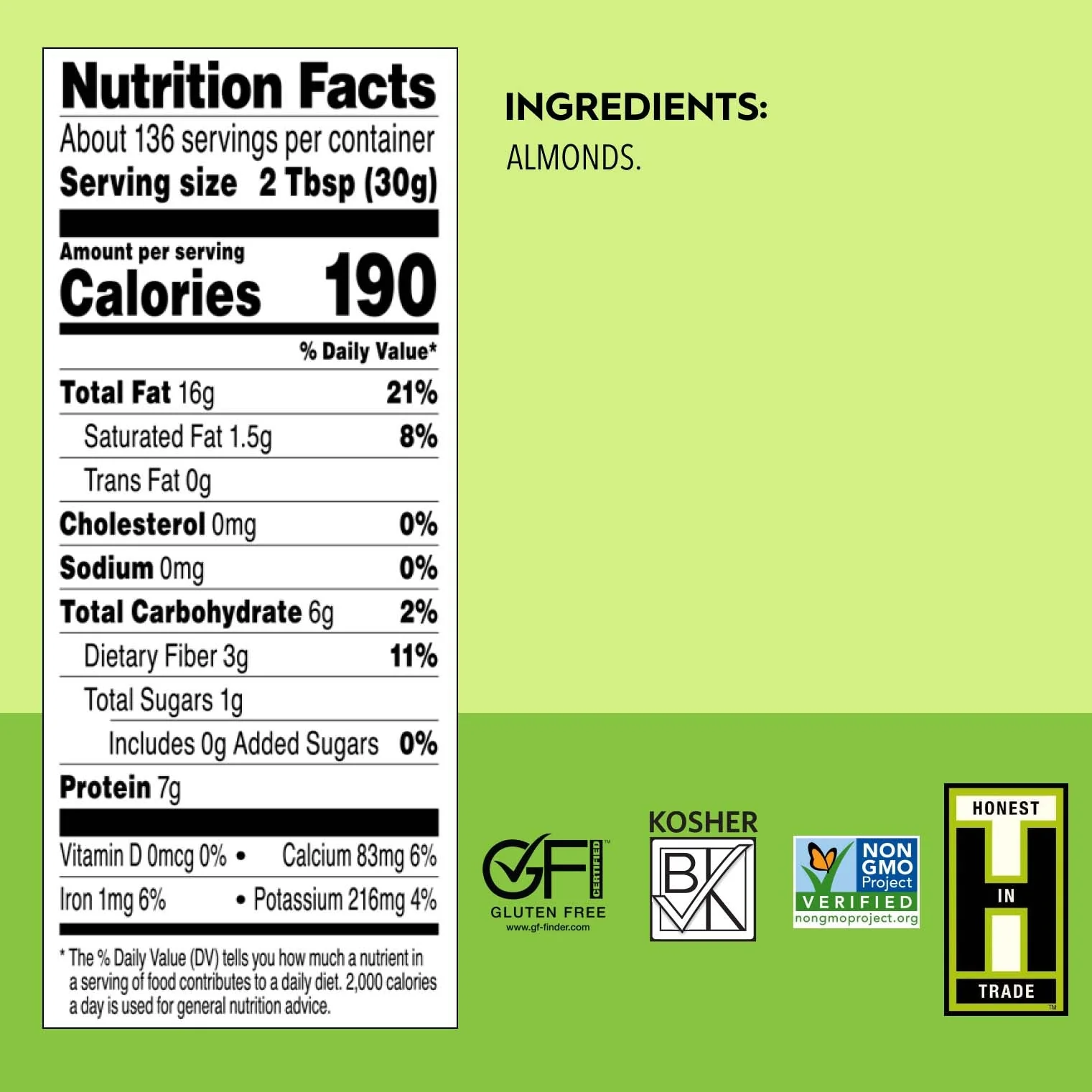 Deliciously creamy, natural almond butter made with just one ingredient - lightly toasted almonds. Packaged in a 9-pound plastic bucket to easily use for recipes, baking, smoothies, shakes and more! Equivalent to 9 jars.