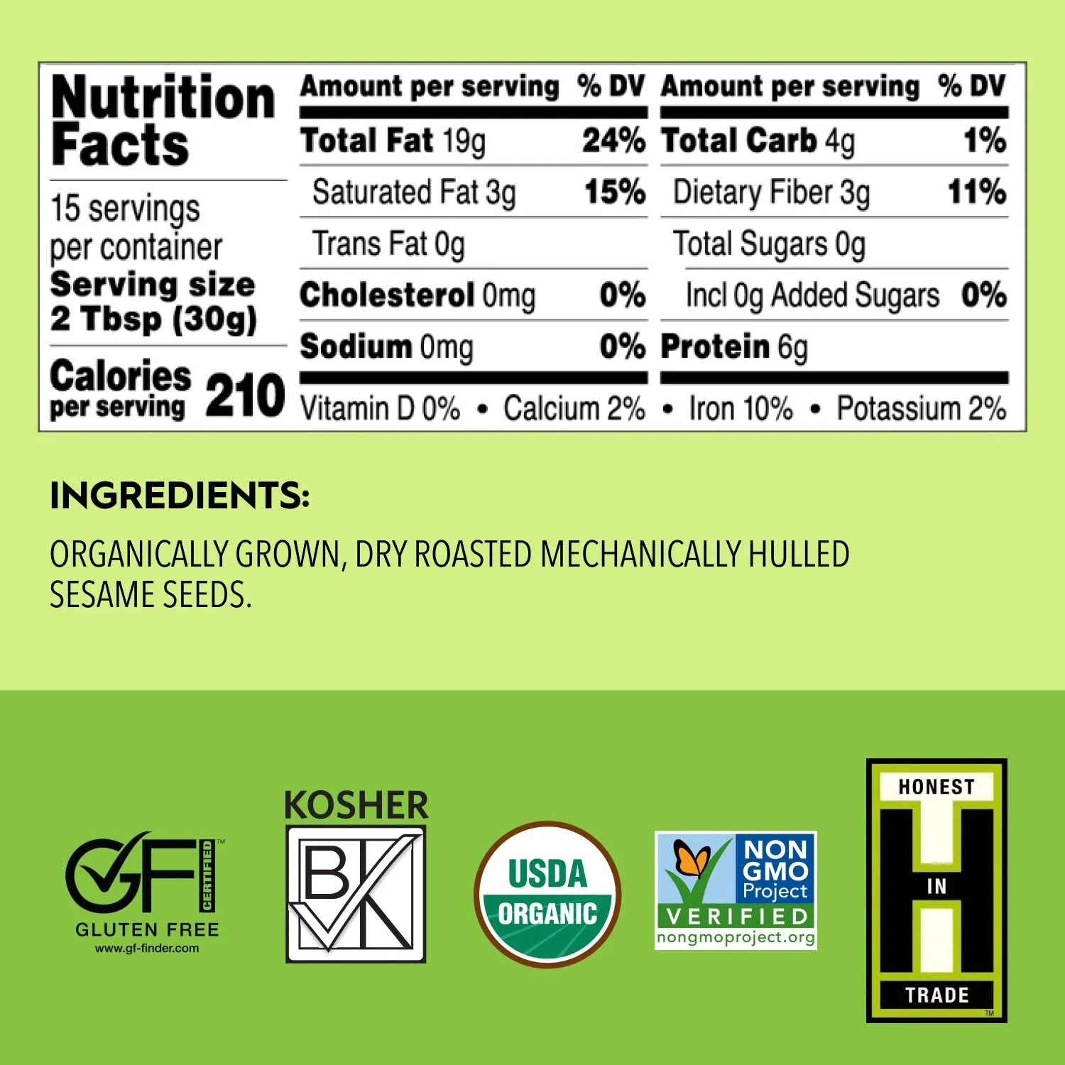 Deliciously creamy, organic sesame tahini made with lightly roasted, organically grown sesame seeds that are milled creamy. Contains just one ingredient - sesame seeds! Salt free and unsweetened.